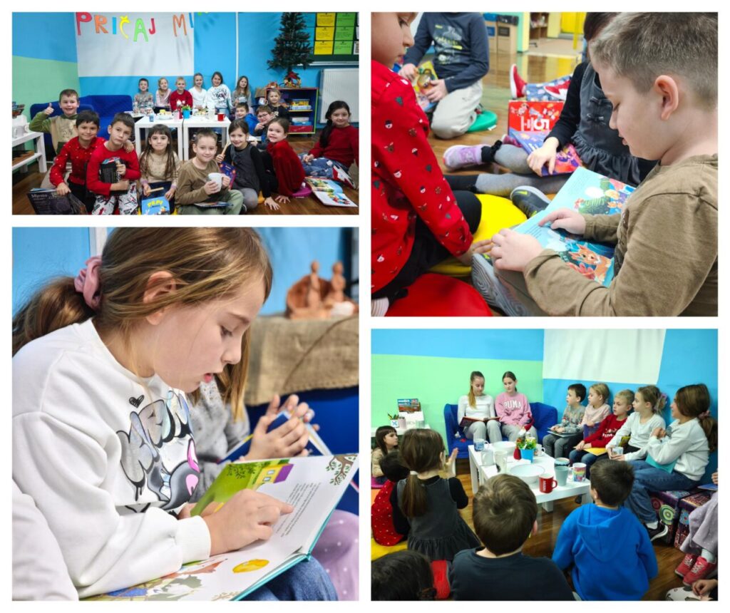 Naši najmlađi čitači čitali su naglas jedni drugima svoje omiljene dijelove priče ili pjesmice. Mali čitači bili su ponosni što sve uspješnije savladavaju vještinu čitanja i što će svoj napredak u čitanju pokazati svojim prijateljima iz razreda. Za kraj čitalačkog druženja, pripremili smo im malo iznenađenje – posjetili su ih učenici iz 7. i 8. razreda i pročitali im nekoliko prigodnih priča iz Knjige božićnih radosti Nade Iveljić te iz vlastitog iskustva potvrdili važnost stalnog vježbanja čitanja i stvaranja navike čitanja, posebno kod kuće.