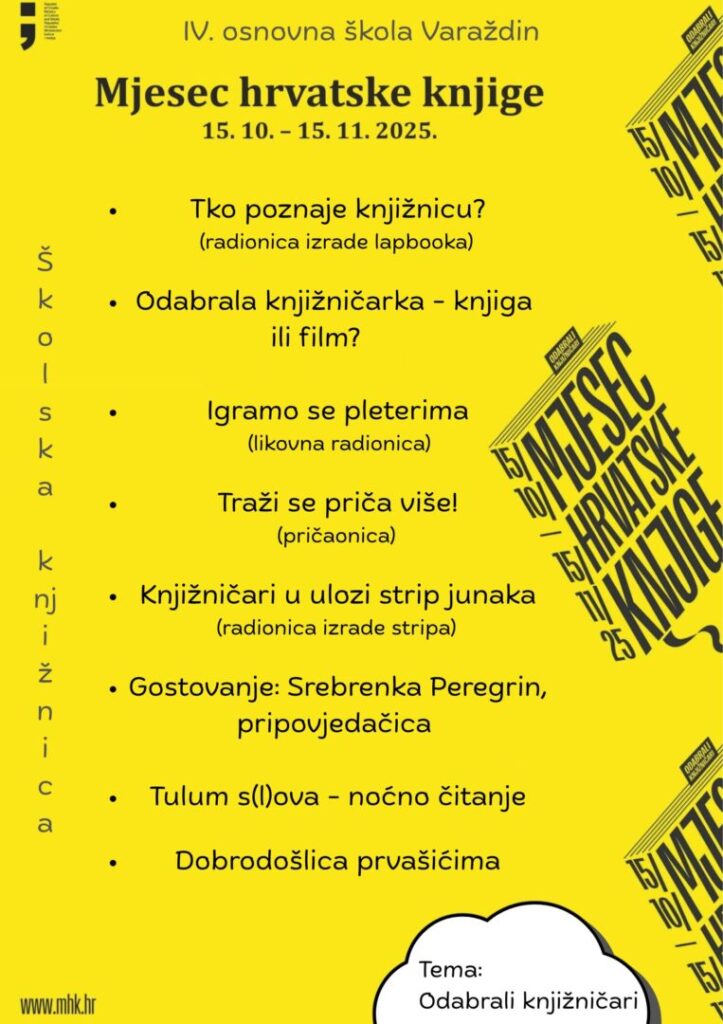 Danas započinje književno-kulturna manifestacija Mjesec hrvatske knjige širom Hrvatske i traje do 15. studenoga. Ove je godine posvećen onima koji čine srce svake knjižnice, onima koji nisu samo stručnjaci za knjige i čitanje, nego stvaratelji okruženja u kojem znanje raste, kultura se stvara i umnaža – knjižničarima.