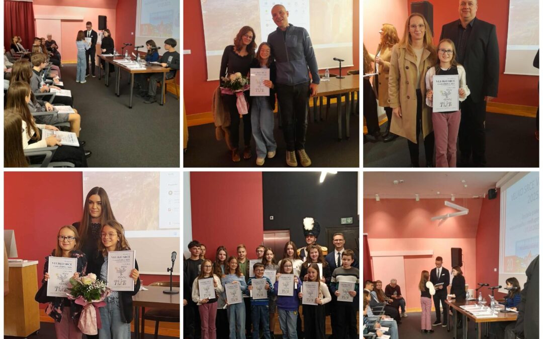 U ponedjeljak, 27. listopada 2025., održana je svečana podjela plaketa Veliko srce Varaždina koju su dobile naše učenice Tia Tadej i Ema Pihir. Svečanoj podjeli nazočili su i njihovi ponosni roditelji te ravnateljica škole Marjana Boršćak-Sudec. Čestitamo našim djevojčicama velikog srca, a ostale pozivamo da se trude biti dobri i činiti dobro jer ovakva priznanja vrijede više od svih materijalnih uspjeha. Kojim su zaslugama bile odabrane upravo Tia i Ema? U nastavku je prijedlog za nominaciju kojeg smo morali sročiti u pet rečenica. Mogli bismo o njima pisati i puno više, ovo je samo dio pohvala koje su napisali njihovi prijatelji.